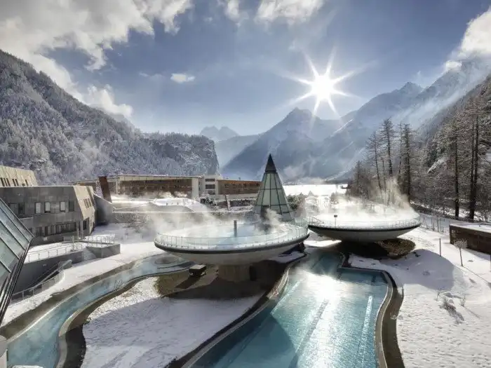 Aqua Dome Längenfeld похож на роскошный спа-центр из научно-фантастического фильма, в котором представлены современные строения, спрятанные в величественных Альпах. Aqua Dome — это два термальных бассейна, наполненных родниковой водой, подогретой до 36 С°.