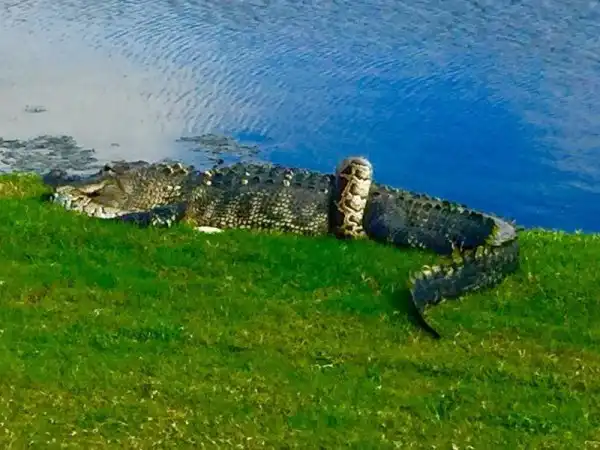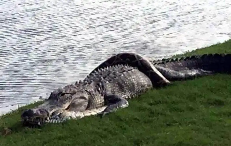 В штате Флорида прямо на поле для гольфа аллигатор и питон сошлись в смертельном поединке. Очевидцы, игравшие в это время на поле, посчитали, что победа на стороне крокодила: в его пасти находилась голова змеи, а он сам спокойно лежал с открытыми глазами. Позже гольфисты рассказали, что победитель утащил мертвого питона под воду.