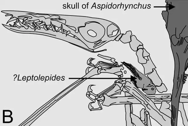 Изучив скелеты, палеонтологи определили, что один из них принадлежит птерозавру рамфоринху, а другой крупной лучеперой рыбе Aspidorhynchus.