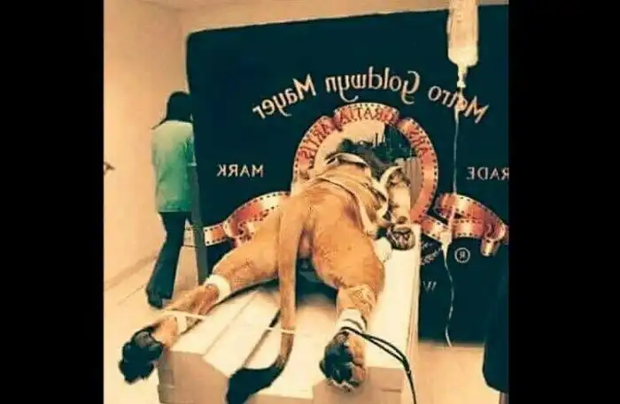Кто же на самом деле изображен на снимке? Это лев Самсон из зоопарка Хай Кеф в израильском Ришон Ле Ционе. В январе 2005 у животного обнаружились серьезные неврологические рассстройства. Ветеринар-невролог Мерав Шамир из Еврейского университета в Иерусалиме, назначил льву МРТ. Именно эту процедуру мы и наблюдаем на фото, сделанном в январе 2015-го. По результатам исследования Шамир провел новаторскую операцию на мозге Самсона, вернув льву здоровье.