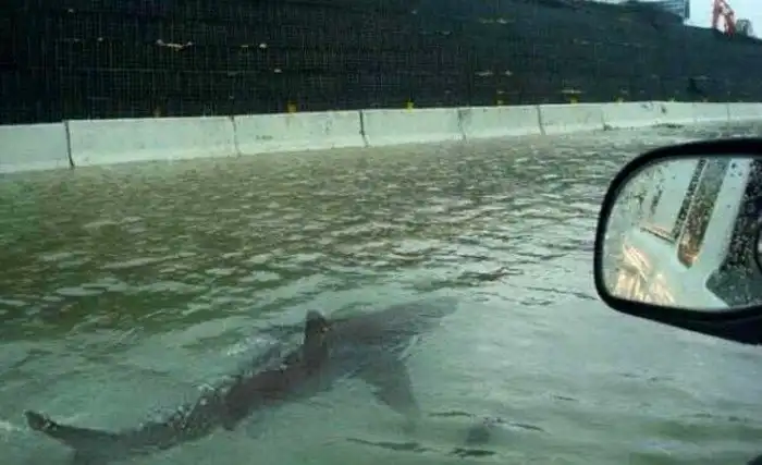 Это фото появилось в сети осенью 2017-го, после того, как по США прошли ураганы Ирма и Харви, сея разрушения. Утверждалось, что снимок сделан на шоссе I-75 возле Неаполя, штат лорида. Впрочем, по другой версии дело происходило на шоссе неподалеку от Хьюстона, штат Техас. Джейсон Майкл, журналист из Дублина, разместил то фото на своей странице в твиттере - и оно мгновенно набрало 88 000 репостов. Джейсон тут же объявил, что это всего лишь шуточный коллаж, выполненный в фотошопе, - но было поздно.