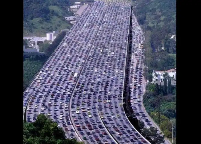 Тем не менее, сколь бы реалистичными ни были пробки в Китае, на фото выше изображен совсем не Китай. Это шоссе 405 к северу от Лос-Анджелеса. Правда, кто-то здорово поработал над ним с помощью фотошопа, в результате чего дорога стала чуть ли не вдвое шире, чем на самом деле. Тем не менее, вилла с кипарисами справа и здание станции слева от шоссе однозначно подтверждают, что это - то самое шоссе.