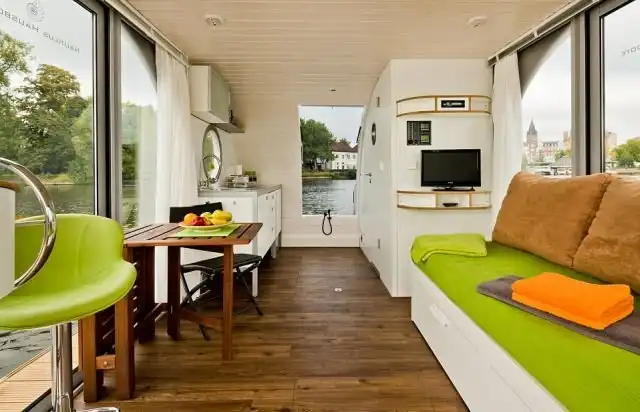 За эти деньги покупатель получает небольшой плавучий дом с внутренним пространством в 16 квадратных метров. Плавучий дом включает гостиную с панорамными окнами, кухню, санузел с душем и спальню. Кроме того здесь есть терраса для отдыха и площадка для солнечных ванн на втором ярусе. За дополнительную плату можно расширить комплектацию плавучего дома, добавив сюда, например, сауну.