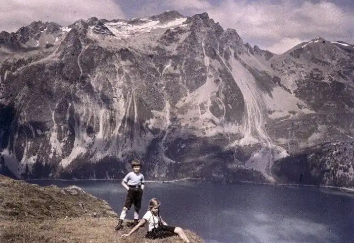 Процесс экспозиции для автохромных фото был гораздо длительнее, чем для черно-белых, поскольку изображение должно было пройти не только через слой крахмала на пластине, но и через дополнительный желтый фильтр. На снимке - дети знаменитого австрийского химика доктора Фидриха Панета, 1920 год.