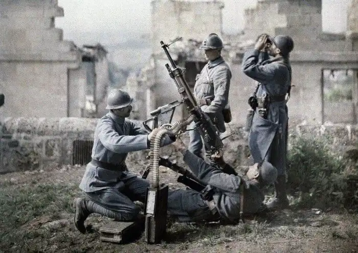 Первая мировая война. Французский пулеметный расчет занимает позицию во время битвы при Эсне, 1917 г.