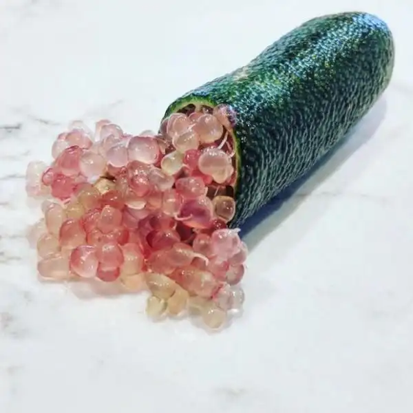 Это диковинное для нас растение называется пальчиковым лаймом и растет оно в Восточной Австралии. Внутри плодов с тонкой кожицей, которая может быть зелёного, жёлтого, оранжевого, бордового, красного, пурпурного, коричневого или чёрного цвета, находится мякоть, представляющая собой небольшие шарики с соком внутри. По структуре мякоть напоминает икру рыбы. На вкус она кислая и обладает типичным запахом цитрусов. В Австралии мякоть пальчикового лайма активно используют в пищу, где готовят с ней супы, салаты, рыбные и мясные блюди и даже подают как отдельный гарнир.