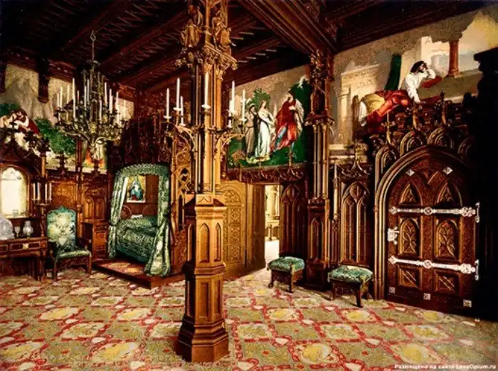Спальня Людвига в замке Нойшванштайн. Очевидцы утверждали, что над изготовлением резной деревянной кровати для Людвига в течение 4.5 лет трудились 15 мастеров: