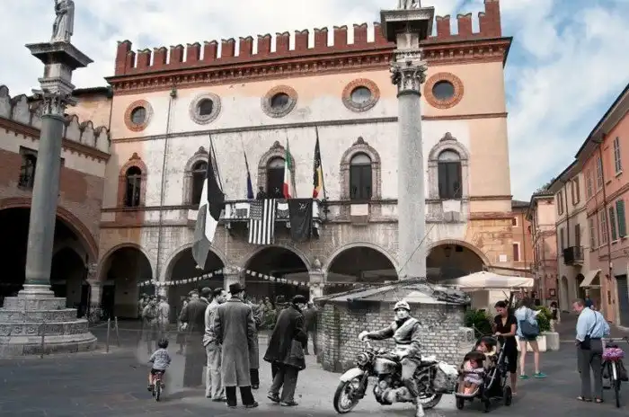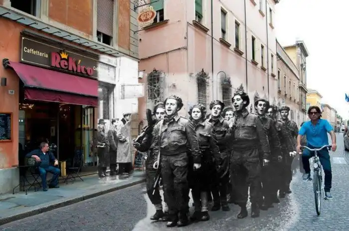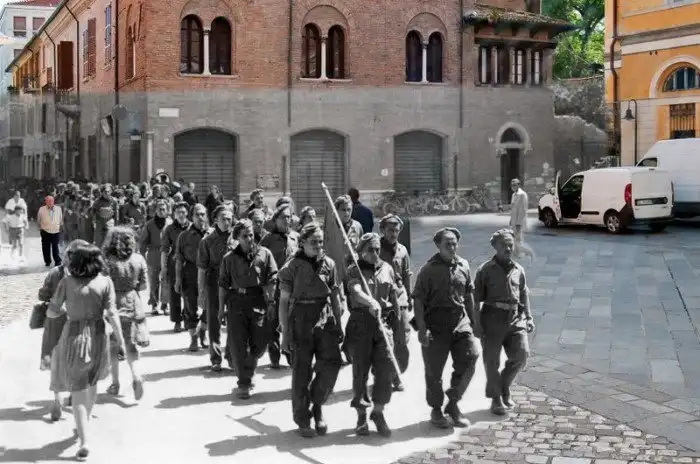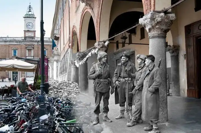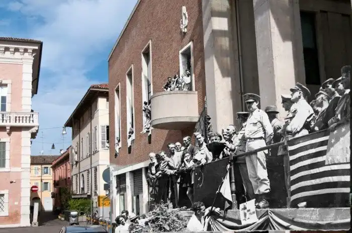 Командиры партизан на балконе мэрии Равенны в день освобождения города