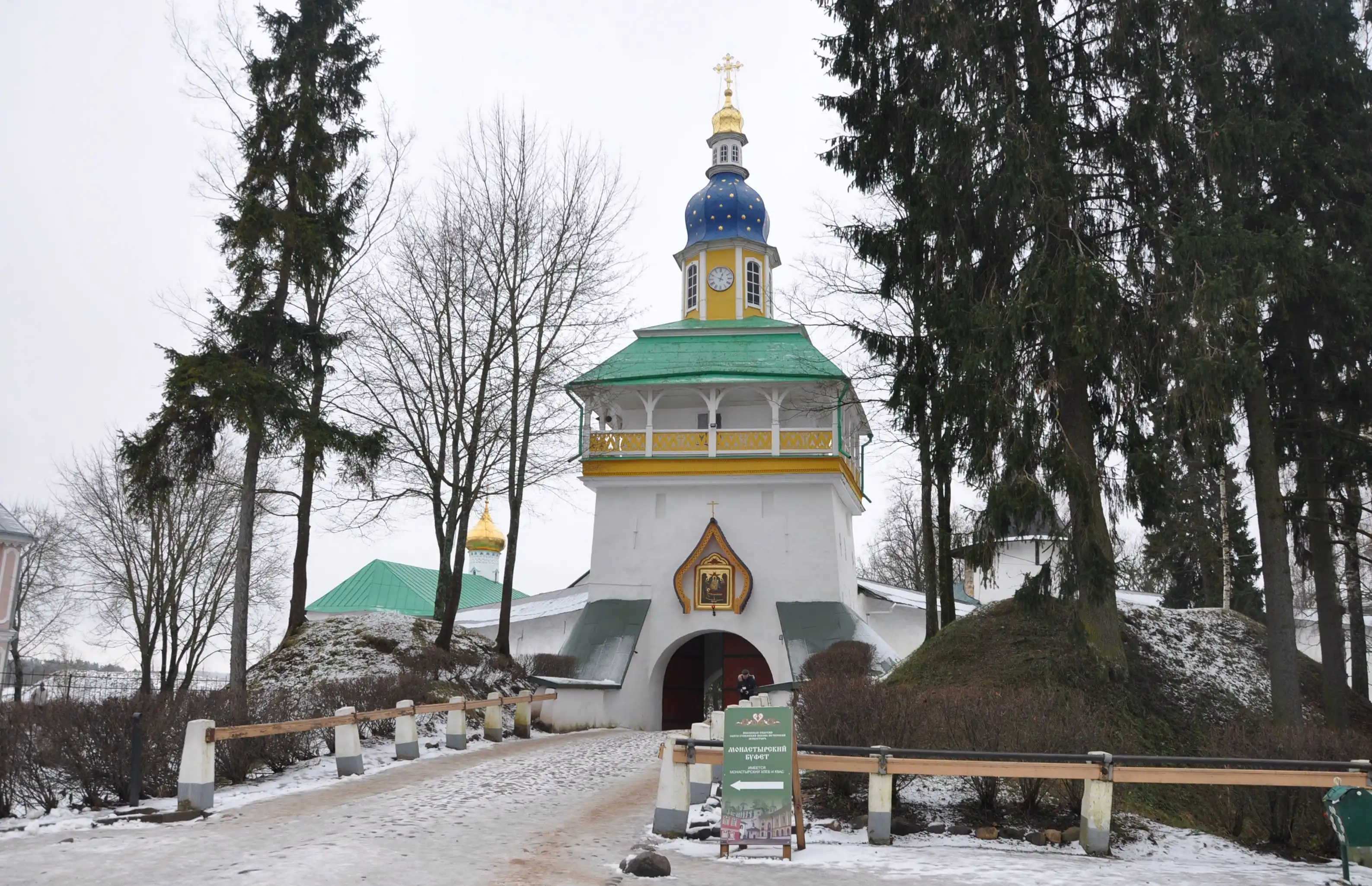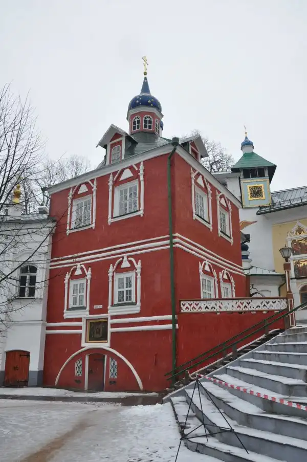Малая звонница Псково-Печерского монастыря. Эта изящная звонница с асимметричным крыльцом была пристроена в 1581 г. к церкви Николы Ратного, выстроенной в 1565 г. и какое-то время , до постройки Башни Святых Ворот, служившей главным входом в монастырь.