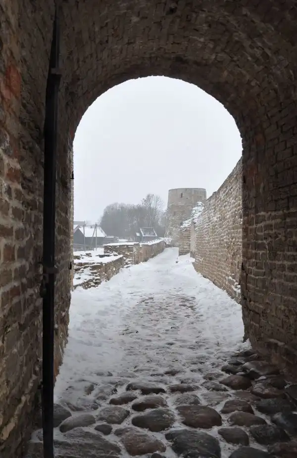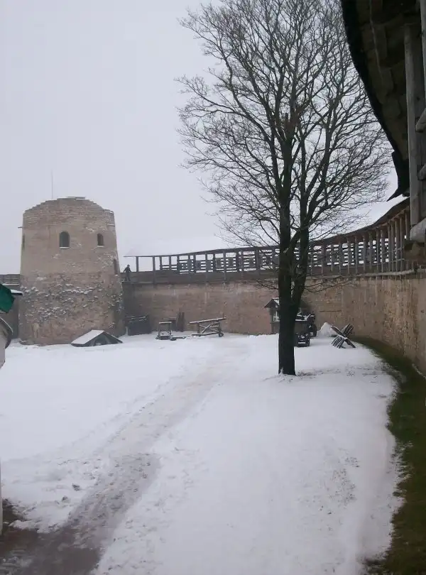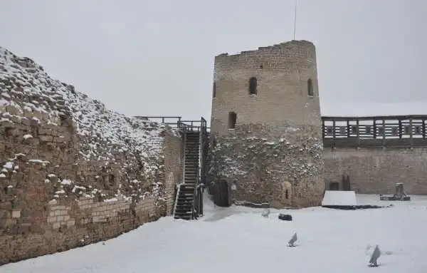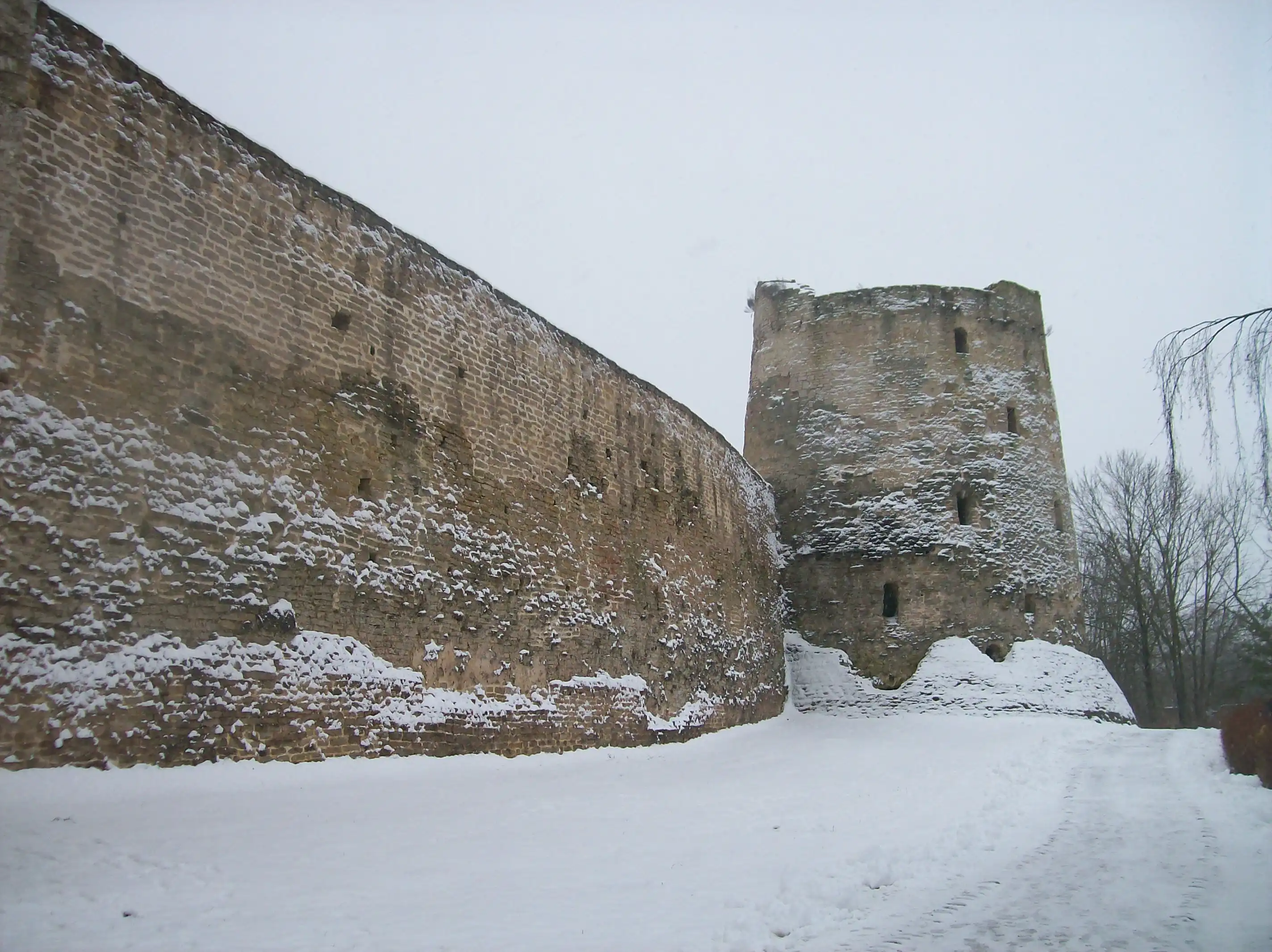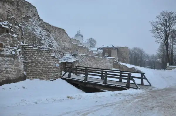 Мы стоим у подножия скалы, из которой выросла Изборская крепость. Выросла не в переносном, а в прямом смысле слова: древние строители вгрызались в скалу, делая её более отвесной, рыли и углубляли рвы, а из вынутого таким образом камня возводили неприступные стены. Башни Изборской крепости не все одинаковой формы: среди сохранившихся шести башен – одна прямоугольная в плане, остальные – круглые. Причины такой разницы сокрыты во мраке веков: то ли назначение у башен было разное, то ли строили их в разное время. Действительно, Изборская крепость вставала на пути у Тевтонских и Ливонских рыцарей, которые двигались в сторону Пскова, начиная с XI и заканчивая XV веком, и её укреплённые башни выдерживали даже натиск средневековой артиллерии.