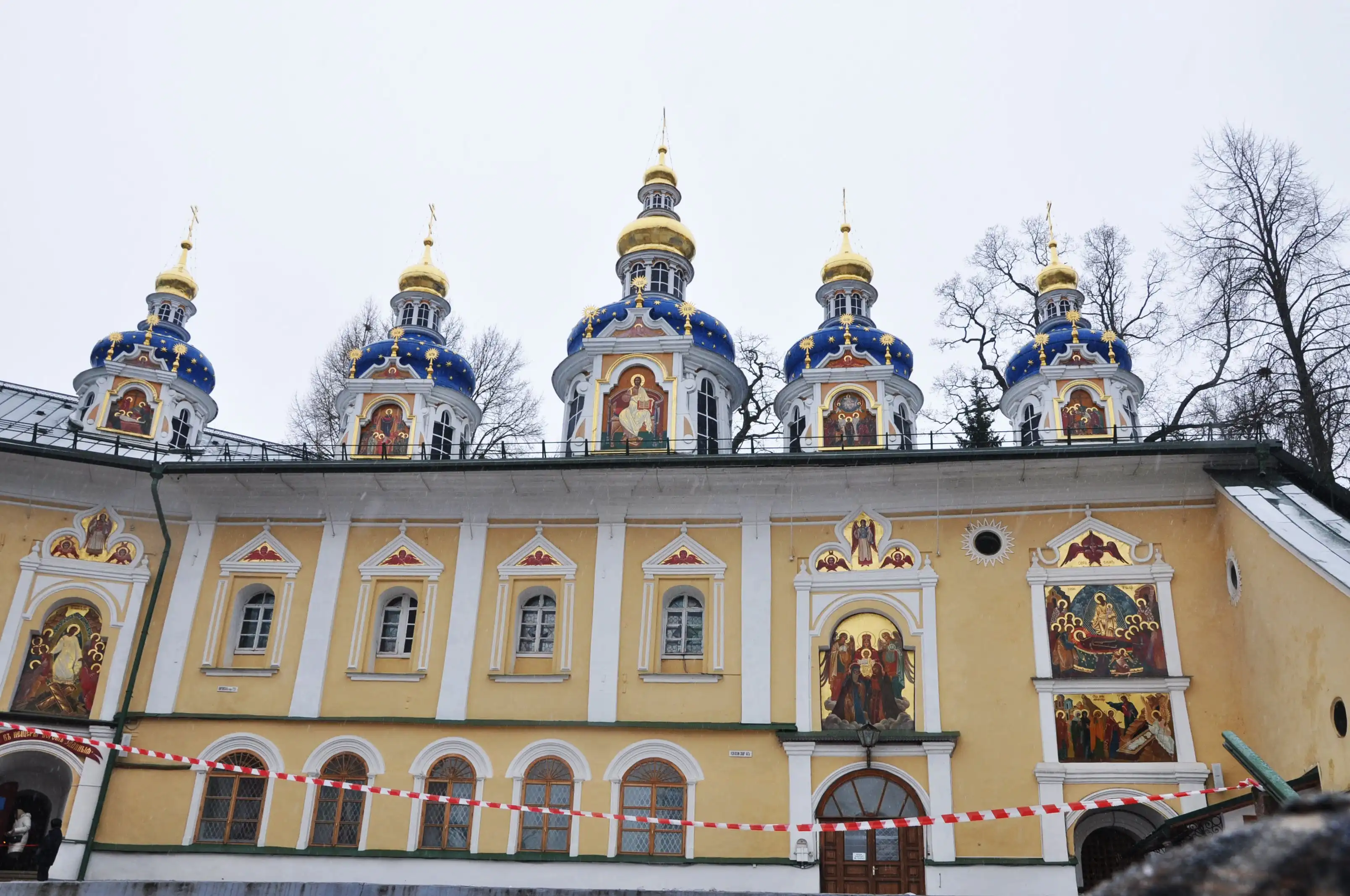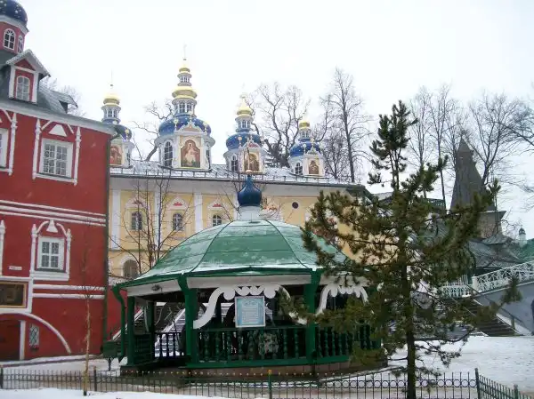 На переднем плане перед Успенским собором, оформленным в стиле украинского барокко (чтобы подчеркнуть связь с Киево-Печерской лаврой) мы видим зелёный шатёр, или сень, установленную над живоносным источником. Этот колодец играл огромную роль для всего монастыря во время многочисленных осад, снабжая защитников крепости водой. Сегодня, чтобы добыть святую воду, надо потрудиться: в источнике нет электрического насоса, всё на ручной тяге – для подъема воды установлена старинная железная колонка, какие были раньше на улицах в маленьких уездных городах.