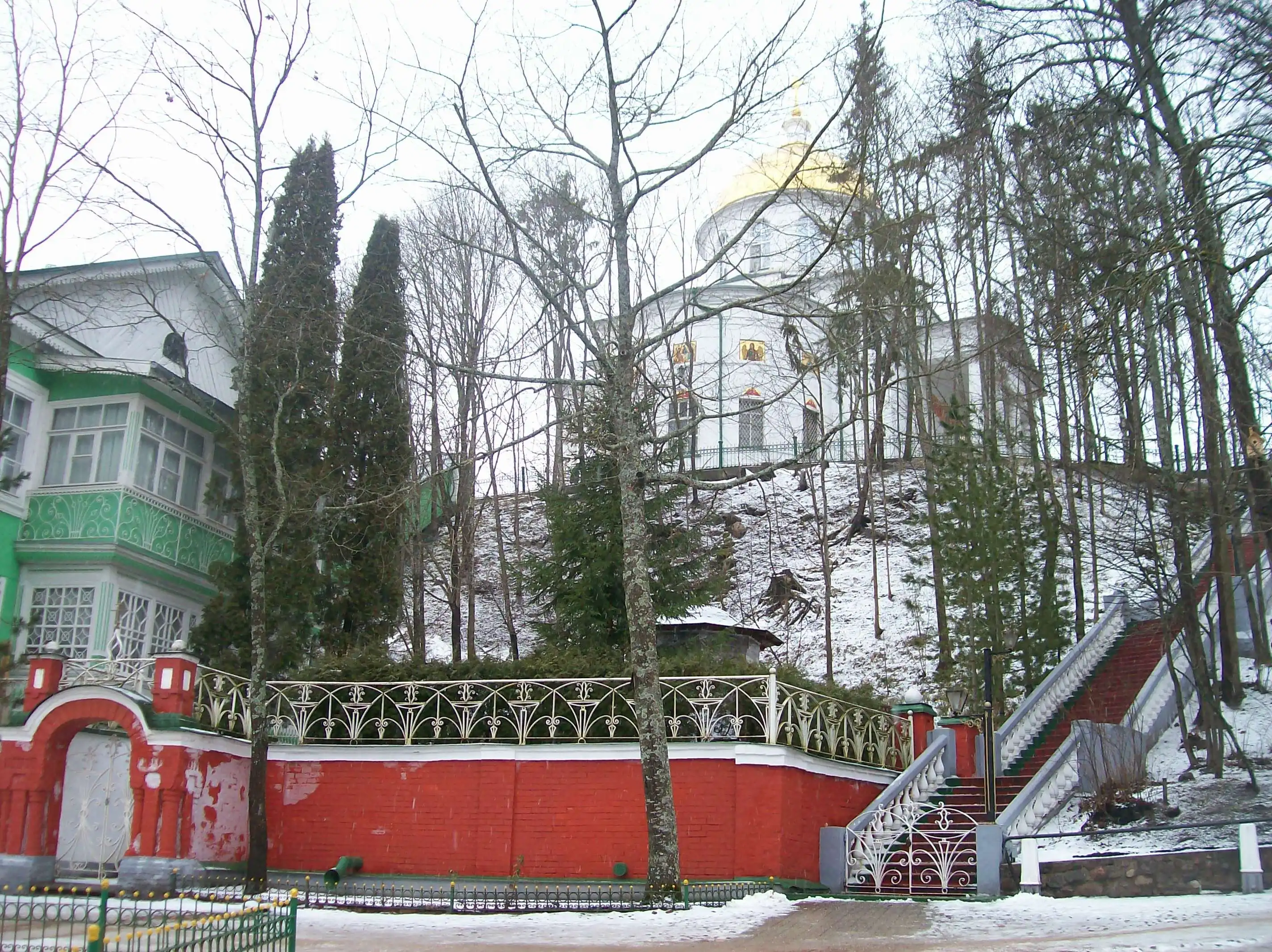 А вот так выглядит обитель изнутри, если смотреть на неё, спускаясь по Кровавому Пути Ивана Грозного от Никольских ворот к Успенскому храму. Она производит нарядное, мирное и светлое впечатление. Многие паломники сравнивают её с воплощением рая на земле. То, что основные постройки находятся в котловине ниже уровня окружающего ландшафта, даёт удивительное чувство защищённости от перипетий жестокого мира, оставшегося вовне за монастырской стеной. Кстати, обратите внимание: внизу справа от дороги торчит серенькая крыша то ли навеса, то ли киоска. Это стеклянный павильон (к сожалению, окна залеплены снегом и вообще давно не мыты) в котором хранится карета императрицы Анны Иоанновны. Она часто приезжала сюда замаливать многочисленные грехи , когда ездила навещать свои курляндские владения, но однажды она так заторопилась по государственным делам, что решила проехать мимо монастыря, не заезжая в него. Не тут-то было! Вдруг разразилась сильнейшая буря, и императрице пришлось –таки скрываться от непогоды в монастыре. В память об этом назидательном событии она принесла Псково-Печерской лавре в дар свою парадную карету.