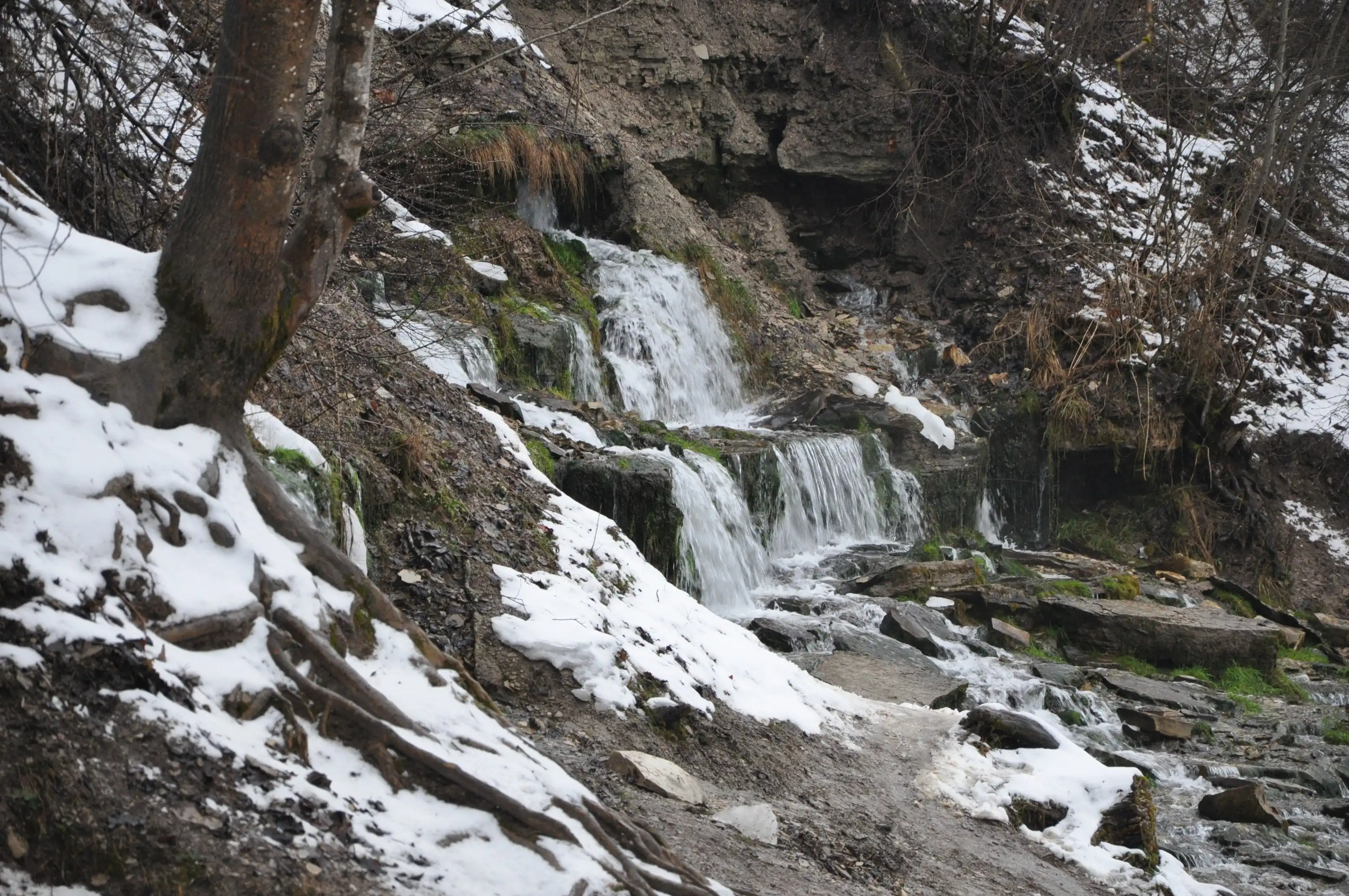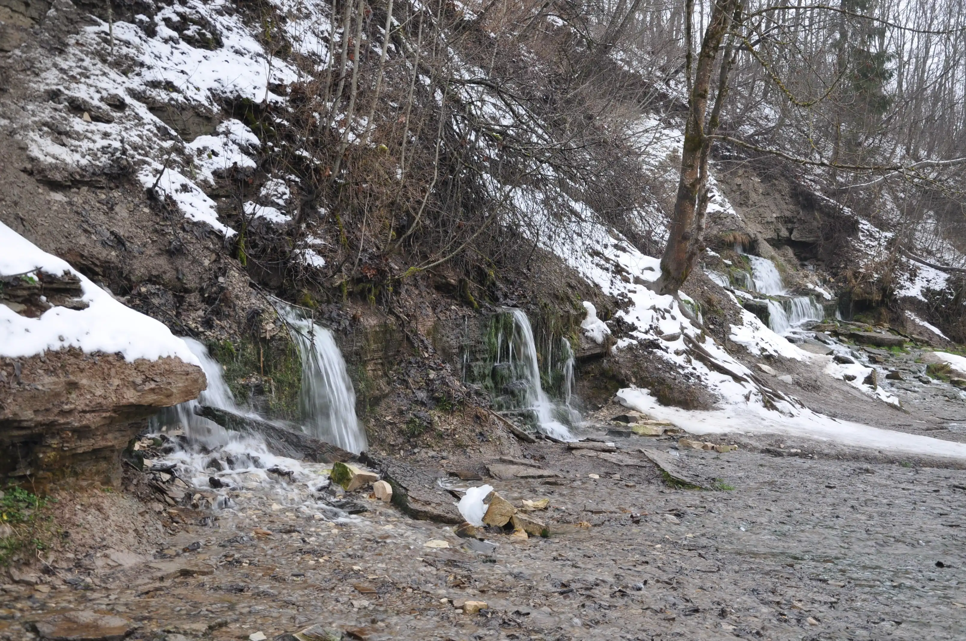 Словенские ключи являют собой зрелище совершенно фантастическое: из почти отвесной стены под напором бьёт вода, ручейки сливаются в бурный поток, кругом сугробы, крутой спуск к озеру весь заледенел, а у подножия водопадов – буйная зелёная трава, ближе к воде – живописные развалины водяной мельницы постройки XIX века. Словенские ключи напомнили мне бурные водопады Пшады в окрестностях Геленджика.