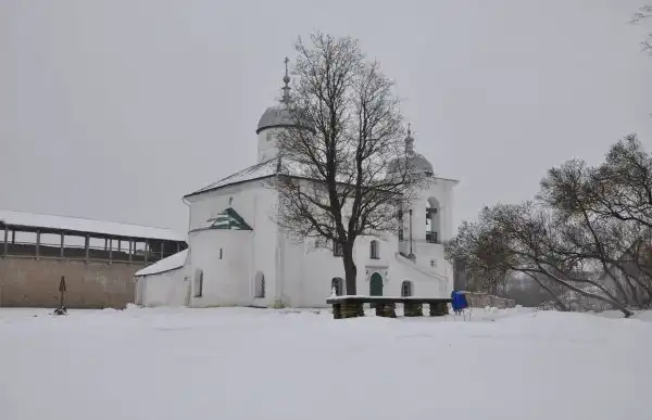 Кусочек Плоской башни и вид на церковь Сергия и Никандра. Храм в честь двух святых – заступника Москвы Сергия Радонежского и пустынника Никандра Псковского изначально был деревянным, и возвели его внутри Изборской крепости сразу после присоединения Пскова к Москве. Во время одного из пожаров деревянная крепость сгорела. Когда храм восстанавливали в камне, его установили уже вне крепостных стен.