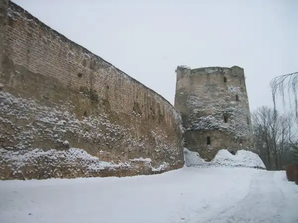 Эту, дошедшую до наших дней, неприступную крепость выстроил в 1330 г. псковский посадник Шелога. При строительстве он учёл удачный рельеф местности : природную возвышенность - гору Жеравью , или Журавлиную, с севера защищает глубокий обрыв, с юга – овраг, с востока – река Смолка. Западная сторона была укреплена двумя линиями рвов и четырьмя мощными башнями. У крепости было аж два захаба (т.е. узких коридора от ворот, затруднявших проникновение врага в крепость ) – один начинался у прямоугольной Талавской башни, а другой начинался у круглой башни Темнушка и вёл к Никольским воротам крепости. Проходы в оба эти захаба открывались с западной стороны крепости : во-первых, гора Жеравья с запада пологая, и эта часть крепости носила название «приступной» (т.е. сюда на приступ крепости размахивая мечами и иноземными стягами неслись в атаку враги), во-вторых, основная масса иноземных захватчиков приходила к Изборску именно с запада, со стороны современной Риги. Кстати, из 7 башен крепости 4 находятся на линии западной стены. Так что вряд ли наш Изборск – это Иссабург древних норманнов, хотя бытовало и такое мнение о происхождении названия древнего города.
