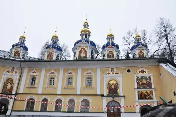 Вид на Успенскую церковь. Изначально она была выдолблена в горе, являясь главным и самым древним храмом монастыря. Успенская церковь имеет только передний фасад, противоположной стеной уходя в гору. За свою многовековую историю она неоднократно обновлялась и расширялась. В 1758-1759 гг. снаружи над подземным Успенским храмом возвели Покровскую церковь. Таким образом, Успенский и Покровский храмы имеют общий фасад. Купола в стиле украинского барокко были возведены над Успенско-Покровским храмом в XIX веке.