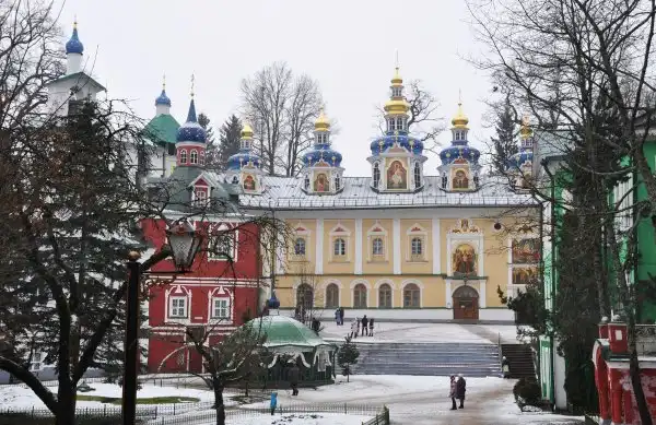 Когда обозреваешь ансамбль монастыря со смотровой площадки, он производит довольно странное впечатление. Во-первых, в отличие от большинства православных обителей и крепостей, он расположен не на горе, а в глубоком овраге, на дне которого протекает ручей Каменец. Мощные укреплённые стены ступенями спускаются по уступам Святой горы, защищая монастырские постройки. Во-вторых, многочисленные яркие здания внутри серых крепостных стен, относящиеся к разным эпохам и к разным архитектурным стилям, кажутся эклектическим и бессистемным нагромождением построек. И лишь попадая внутрь и обозревая ансамбль монастыря со дна оврага, понимаешь, насколько он гармоничен и прекрасен. Псково-Печерскому монастырю вообще присущ некий дуализм: вроде монастырь, но в то же время мощная оборонная крепость, вроде храмы, зовущие ввысь, но частично их помещения располагаются в подземных пещерах Святой горы. Собственно, по этим пещерам монастырь и называется Печерским, то есть пещерным. Даже монастырское кладбище здесь необычное: гробы с покойниками не зарывают, а как бы складируют один на другой в пещерах монастыря. Микроклимат в них такой, что разложения и сопутствующих ему запахов практически нет, но незаметный процесс тления всё-таки идёт, иногда стоящие внизу гробы просто рассыпаются в прах, а установленные на них сверху с грохотом проседают вниз, чтобы дать место другим, новым захоронениям.