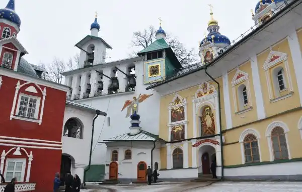 Большая звонница монастыря (потому что есть ещё и малая). Монастырская звонница, украшающая Успенскую площадь, была построена в 1523 г. на месте старой деревянной. Она насчитывает шесть основных пролётов (звонов) и седьмой, пристроенный позднее над ними, благодаря чему образуется как бы второй ярус. Все колокола изготовлены псковскими мастерами, украшены орнаментами, фигурками животных, рельефными надписями. Полиелейный колокол, подаренный обители Иваном Грозным, весит три тонны, Будничный , который отбивает часы, был отлит по приказу Бориса Годунова и весит две тонны, Большой колокол, вклад Петра Великого, весит четыре тонны. Собрание колоколов Псково-Печерского монастыря – одно из самых значительных как на Псковской земле, так и на Северо-Западе России в целом.