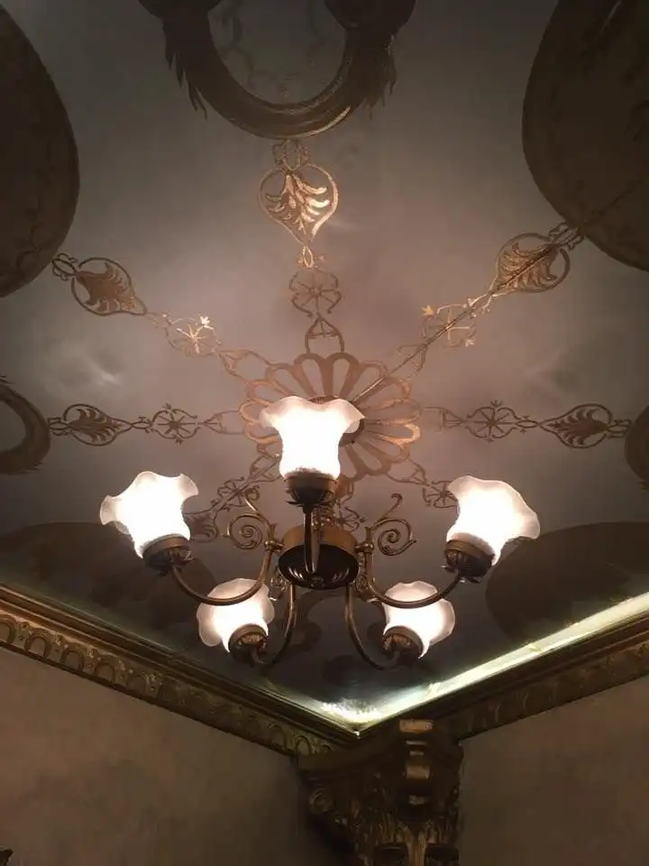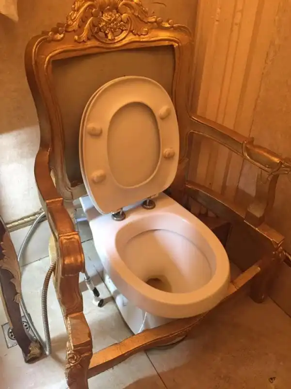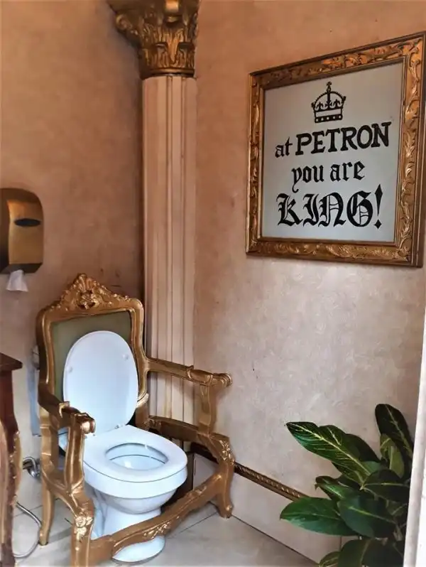 В уборной есть деревянный трон вокруг унитаза, настенные и потолочные украшения, большое зеркало в богатой раме, люстра и табличка на стене с надписью "В Петроне вы король!".