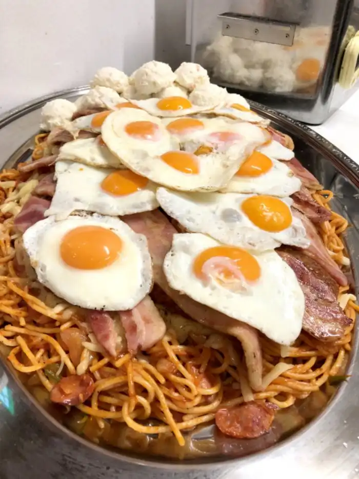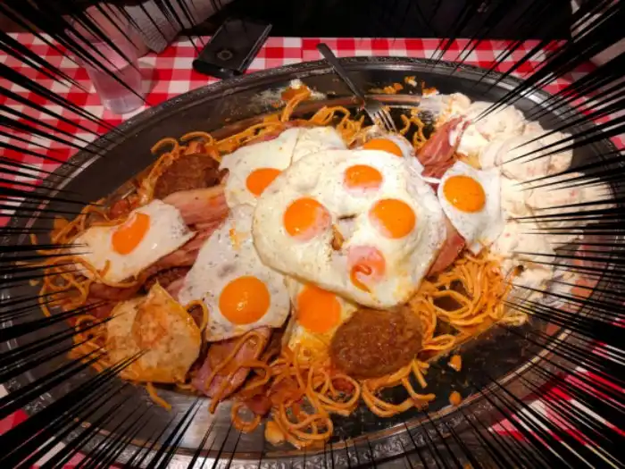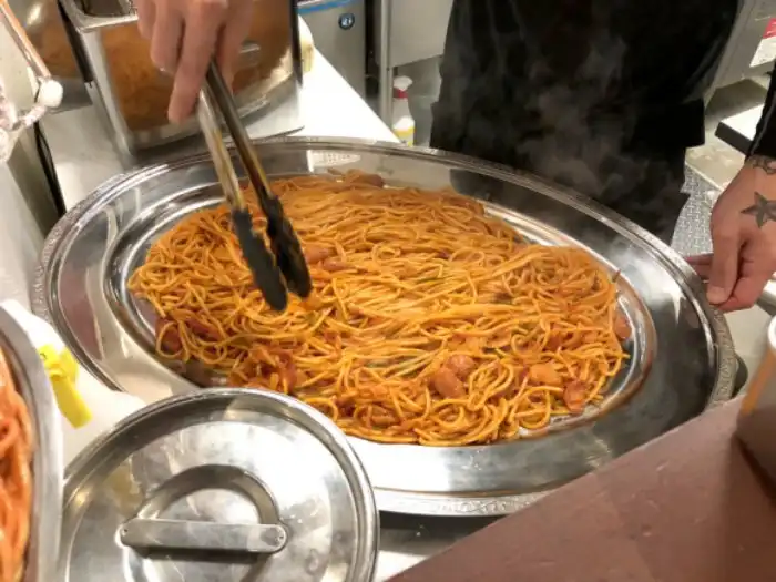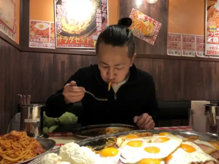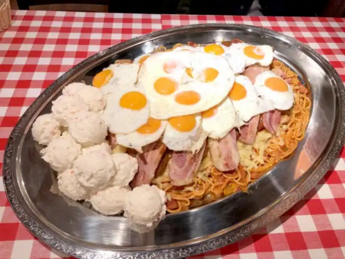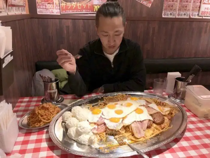 Один из ресторанов в Токио предлагает блюдо под названием "Спагетти по-неаполитански". Порция XXXL стоит 10000 йен ($91 по курсу). Если найдется псих, который сможет сожрать всё это за определенное время, то можно будет не платить. Что тут есть?