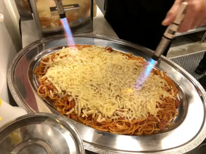 На огромное блюдо с пастой бросают от души потертого сыра, после чего плавят его газовыми горелками