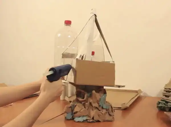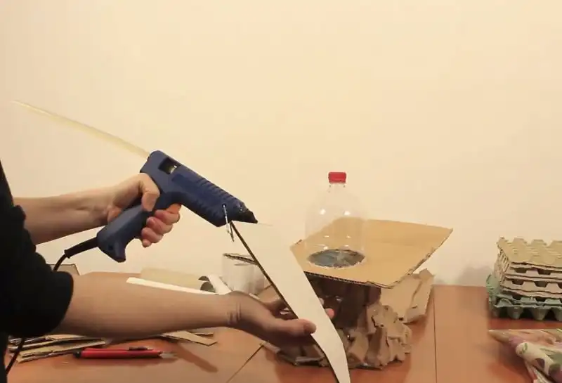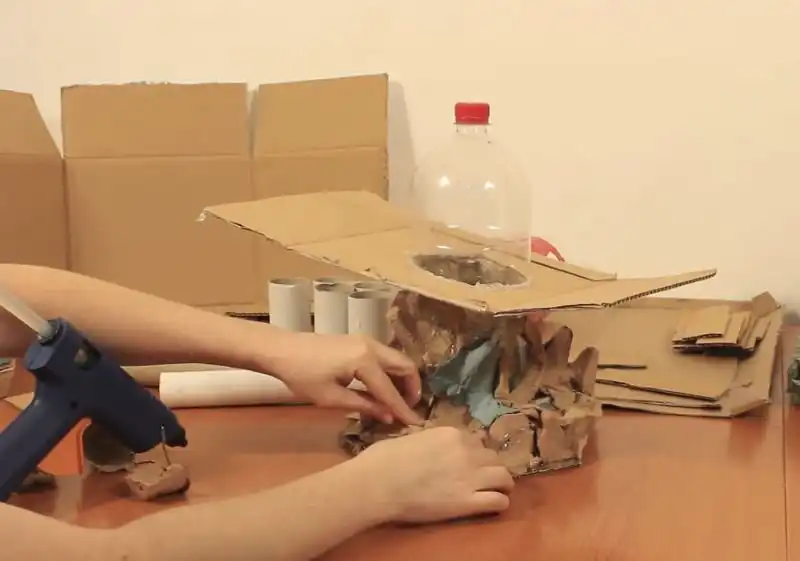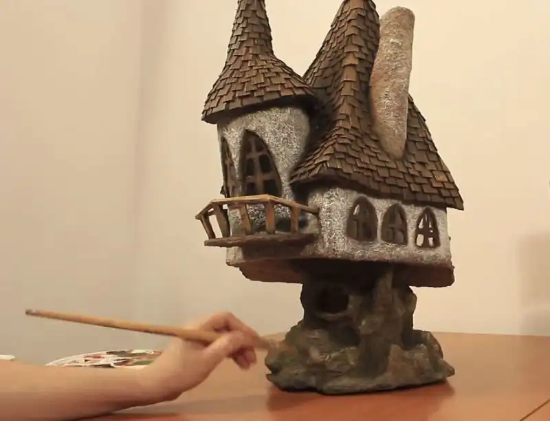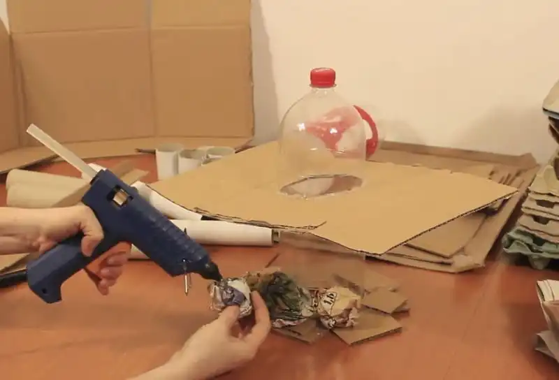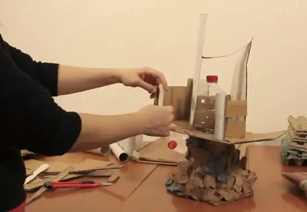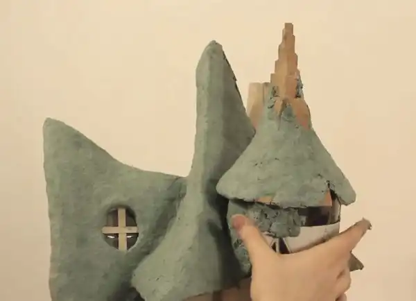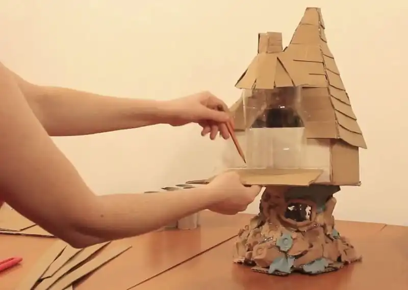 Креативная мамочка по имени Диана похвасталась домиком, сделанным из двух пластиковых бутылок, втулок от туалетной бумаги, картонок и коробки из-под пиццы. Из купленных материалов: акриловые краски, клеевой пистолет и клей ПВА. На поделку ушло 3 доллара и чуть больше недели.