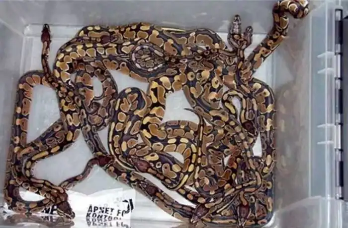 51-летнему пассажиру пришлось открыть свои сумки после того, как рентгеновский сканер обнаружил в них рептилий. Сотрудники службы безопасности аэропорта были потрясены, увидев 247 экзотических змей, упакованных в пластиковые коробки и даже носки! Выяснилось, что этот человек был частью преступной группировки, занимавшейся контрабандой редких и исчезающих видов змей.