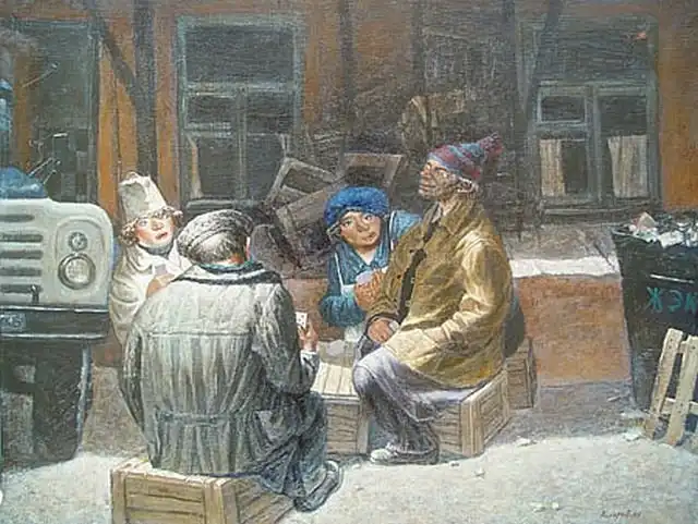 Василий – художник, на картинах которого изображена советская действительность с небольшой долей иронии. Его полотна напоминают зарисовки к детской книжке, они будто бы наполнены непосредственностью, присущей только неиспорченной душе ребенка. У Колотева найдутся самые простые и одновременно самые интересные факты былой действительности. Приятной ностальгии!