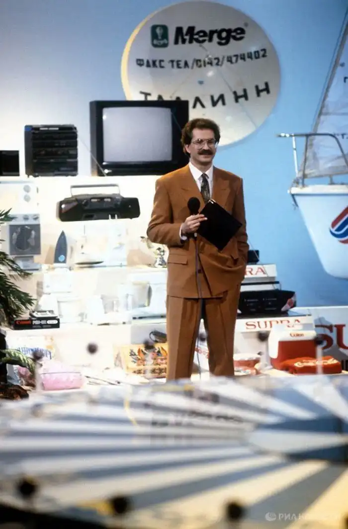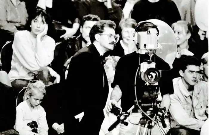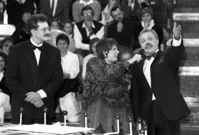 Владислав Листьев, Клара Новикова и Леонид Якубович (слева направо) во время съемок телепередачи "Поле Чудес" в Московском цирке на Цветном бульваре. 29 сентября 1992 года. Фото Николая Малышева /ИТАР-ТАСС/