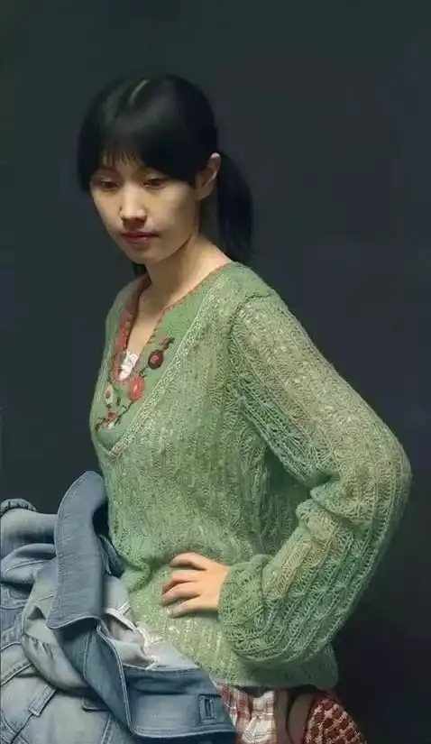 Присмотритесь внимательнее к этому фото. Еще внимательнее. Видите девушку в зеленом свитере? А то, что это не фото, тоже видите? Портрет с невероятной детализацией – на нем прорисована каждая петелька вязки! Вот что значит настоящий художник!