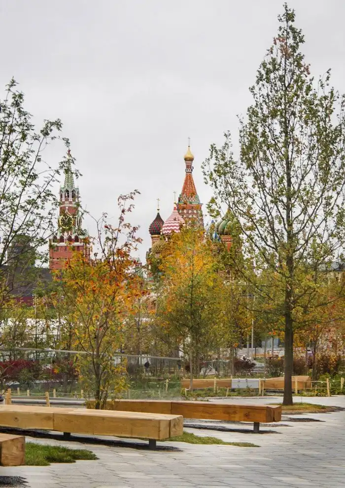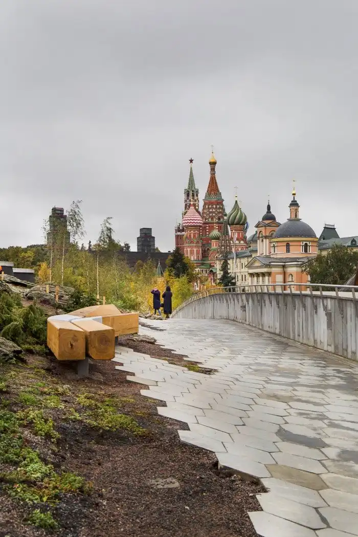 Эти природные зоны создают уютные уголки для встреч и отдыха жителей; здесь также расположены театральные пространства и предназначенные для культурных событий павильоны. Несколько обзорных площадок обеспечивают неожиданные точки, позволяющие по-новому открыть для себя виды Москвы.