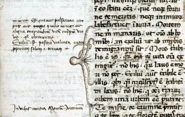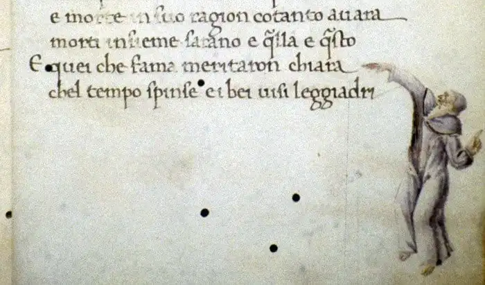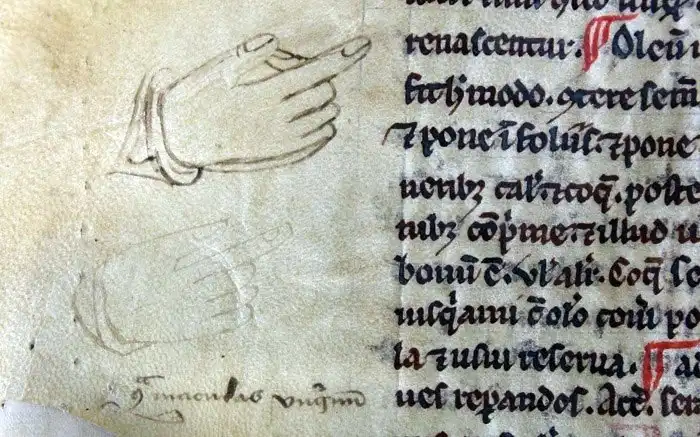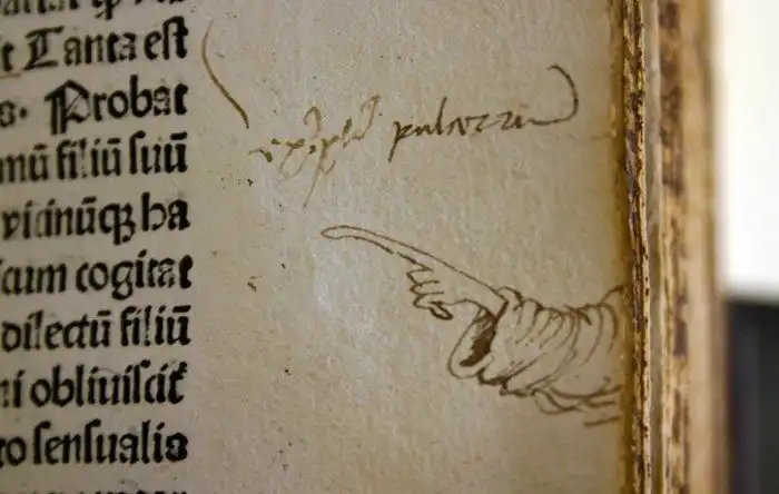 На полях средневековых книг, написанных на пергаменте, найдены интересные знаки в виде пальцев рук или целых фигур людей и животных с указующими перстами, тянущимися к определенной строке, иногда, нескольким. Первоначально можно подумать, что это старались художники-оформители книг, столь изящны и оригинальны эти изображения. Но, это всего лишь «заметки на полях» с целью отметить строку – понравившуюся или требующую запоминания и обсуждения.