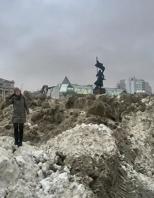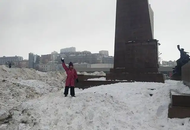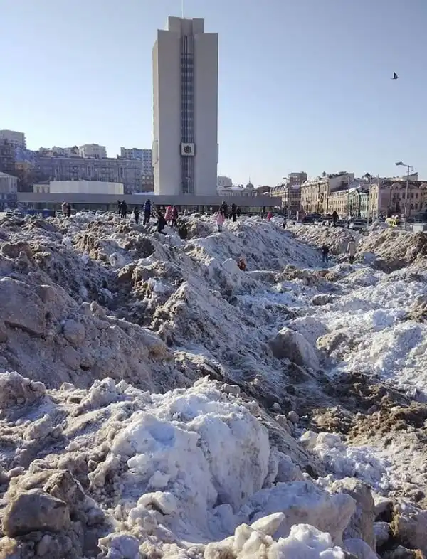 После сильного снегопада во Владивостоке весь убранный с улиц города снег, по распоряжению администрации, был свезен на центральную площадь. Пресс-служба мэрии заявила, что в городе закончились другие площадки для складирования снега, к тому же, перевозить грязный снег в центр города намного бюджетнее, чем на дальние полигоны. Жителям приходится только смириться с таким решением и уживаться с ним, ведь, по прогнозам синоптиков, эти горы снега растают только к середине апреля. Детишки приходят сюда кататься со снежных горок, а взрослые – делать селфи на фоне необычного пейзажа.