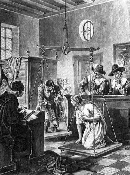 Предполагаемую «ведьму» проводили в специальную Весовую палату. Девушка становилась на огромные ваги. Считалось, что ведьмина метла выдерживает вес до 50 кг. Если вес женщины признавался нормальным, она получала Сертификат, подтверждающий непричастность к дьявольским проделкам. Действовал документ до конца жизни.