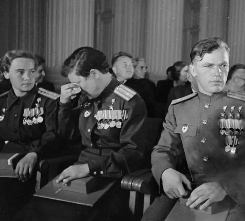 Герой СССР гвардии капитан Антонина Зубкова , Герой Советского Союза гвардии майор Надежда Федутенко и Трижды Герой Советского Союза гвардии майор Иван Кожедуб на церемонии вручения Золотых Звезд Героев.
