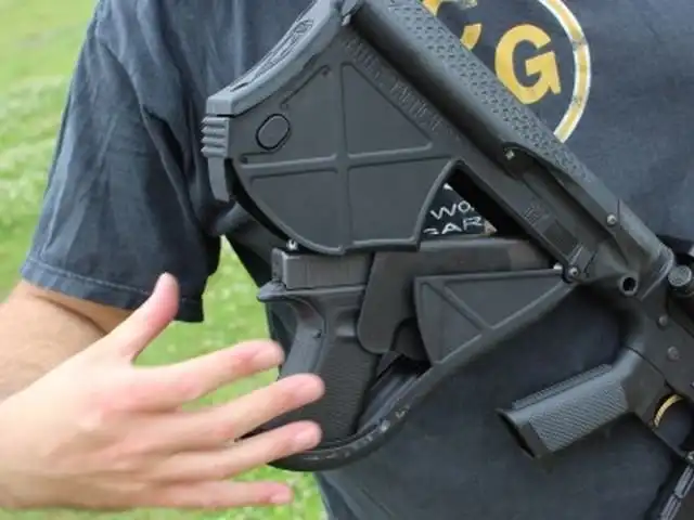 Перед вами тактический приклад MULE, который подходит для большинства современных видов стрелкового оружия и пользуется огромной популярностью в армии США. Всего за 125 долларов этим прикладом, выступающим в качестве футляра для небольшого пистолета, можно оснастить пистолеты-пулеметы, штурмовые винтовки и дробовики. В футляр легко помещаются компактные модели пистолетов Glock и в критический момент, когда в основном оружии заканчиваются патроны, это может спасти жизнь стрелку.
