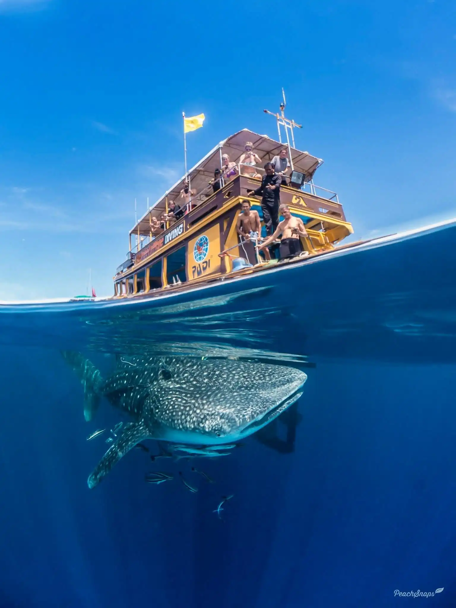 Просто красивое фото. Китовая акула проплывает под бортом прогулочного катера.