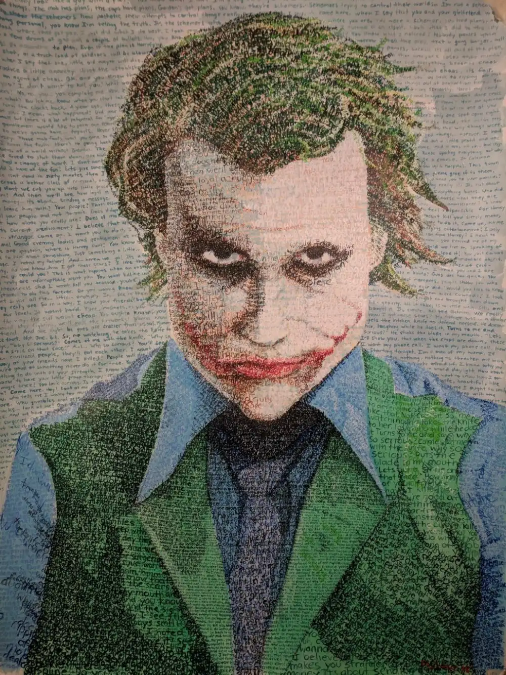 Картина с Хитом Леджером "Джокер", составленная целиком из цитат фильма. На работу у автора ушло более 8-ми часов.