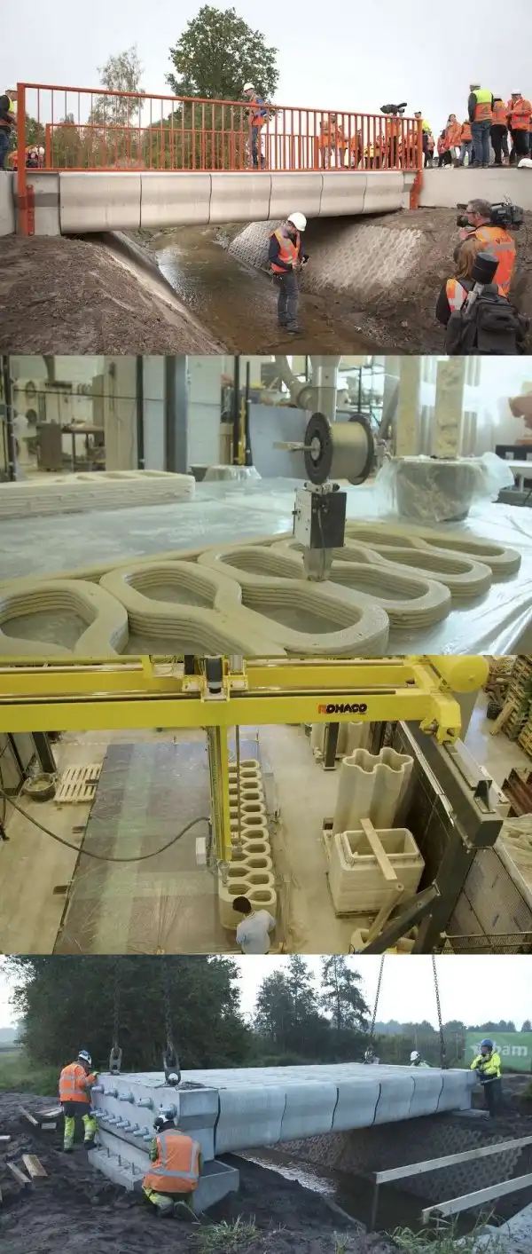 Это с виду ничем не примечательное сооружение, на самом деле является чрезвычайно инновационным мостом. Ведь железобетонный мост длиной 8 и шириной 3,5 метра напечатан с помощью 3D-принтера. Такой подход делает ненужным применение опалубки.