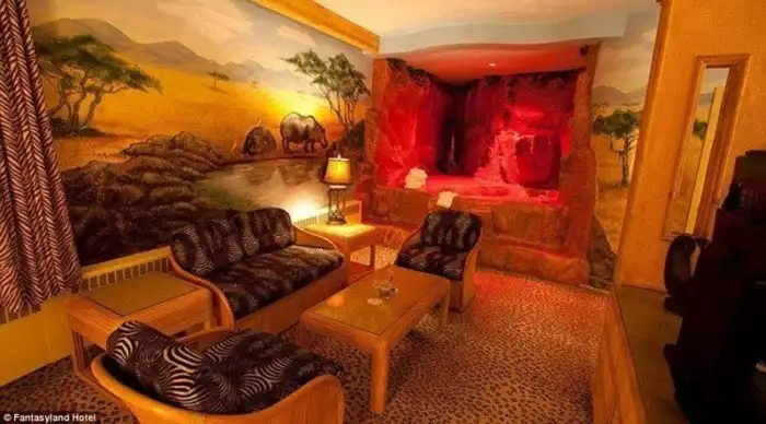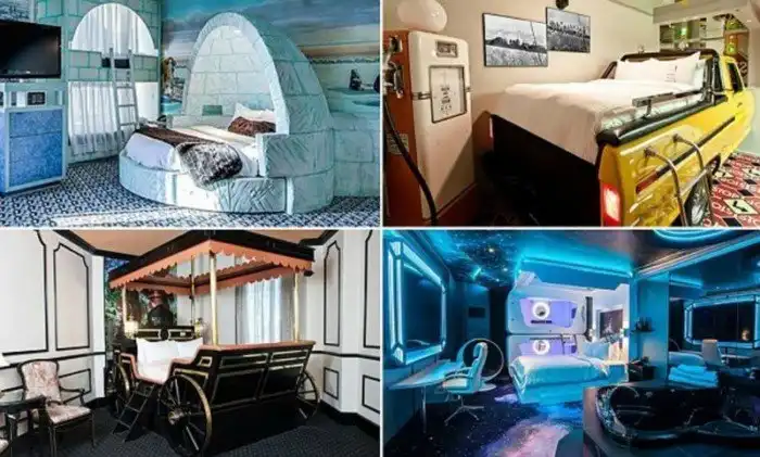 В номере в автомобильном стиле есть всё: и кровать в пикапе, и заправочная станция, и светофор