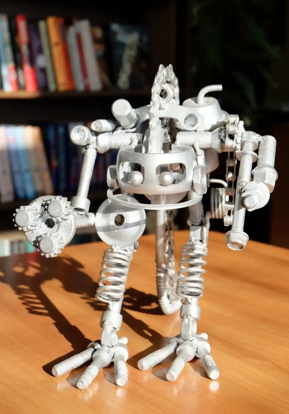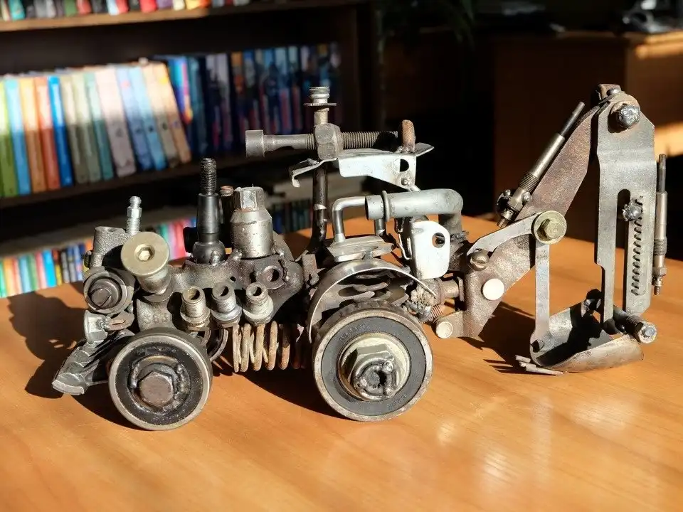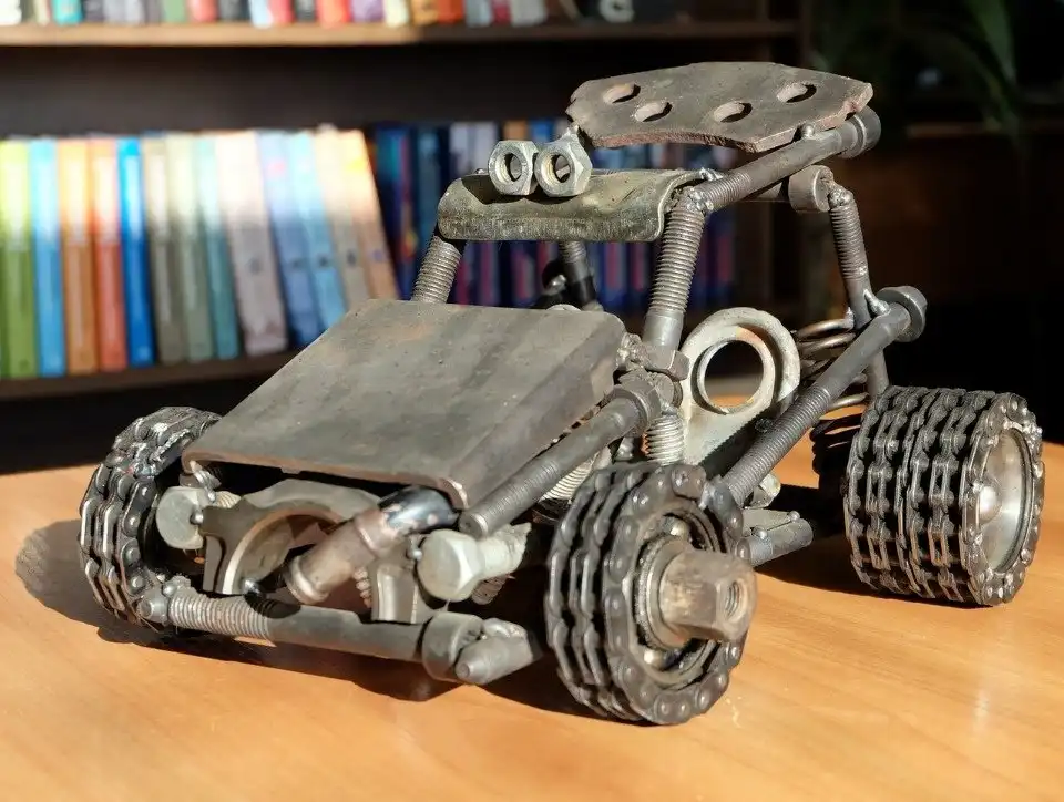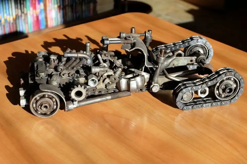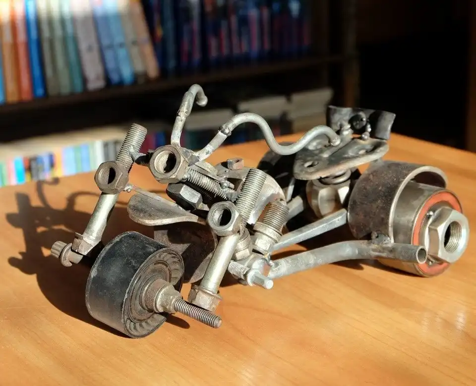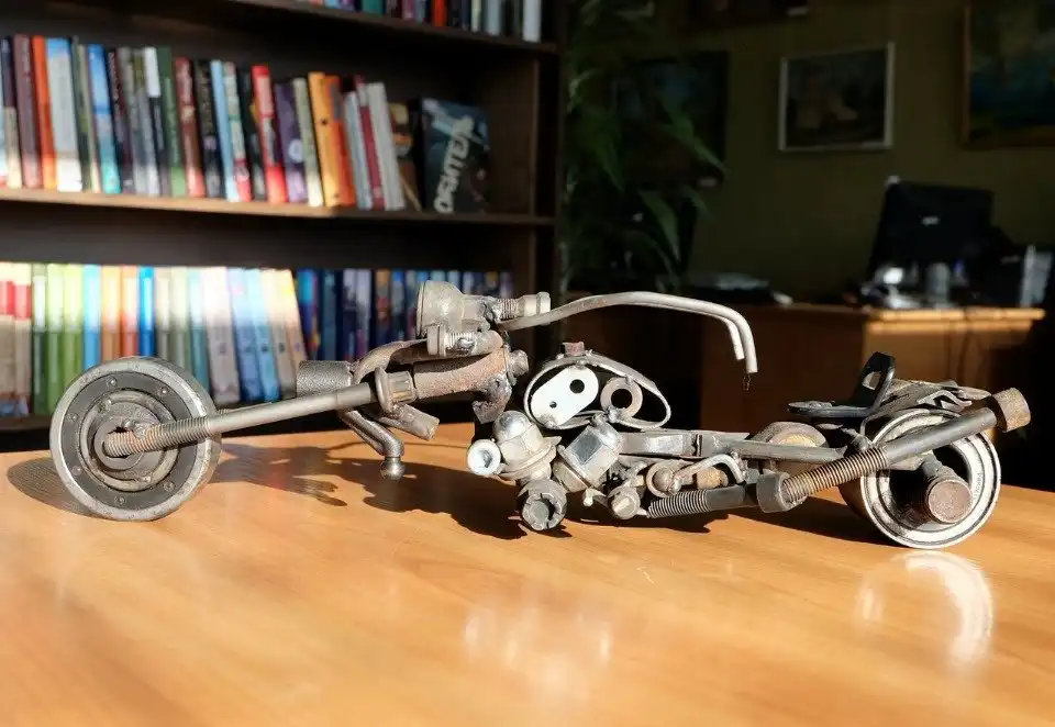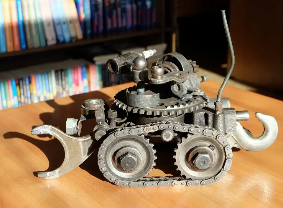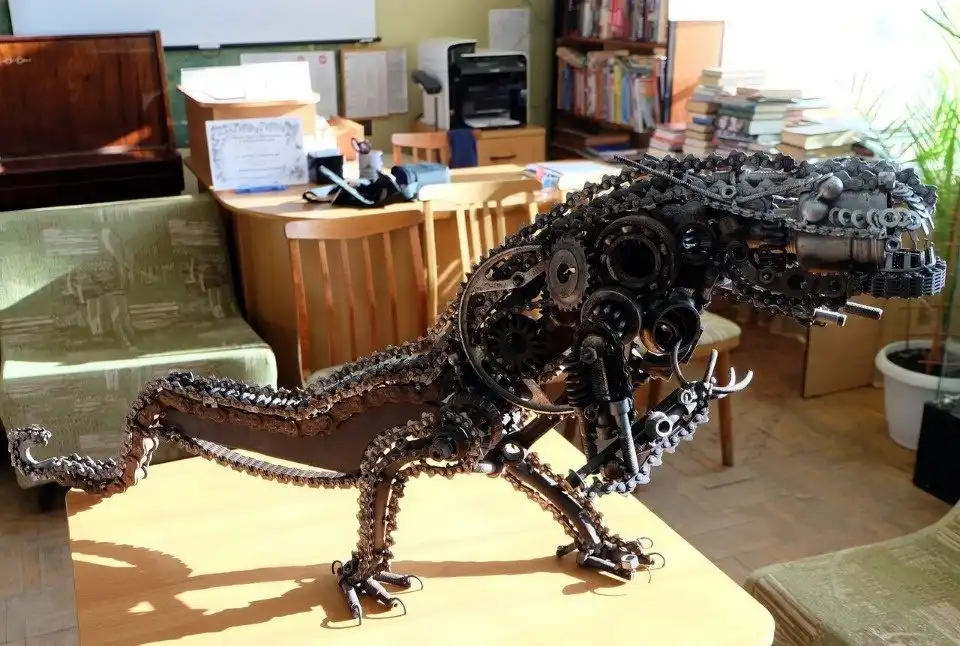 Удивительная выставка работ из старых металлических предметов, оставшихся от ремонта автомобилей, открылась в библиотеке района Любятово «БиблиоЛюб». Суровый гусеничный танк, грозные роботы-трансформеры, всевозможные мотоциклы и автомобили и даже большой грозный динозавр — все фигуры созданы из мелких деталей: подшипников, шестеренок, гаек и болтов.