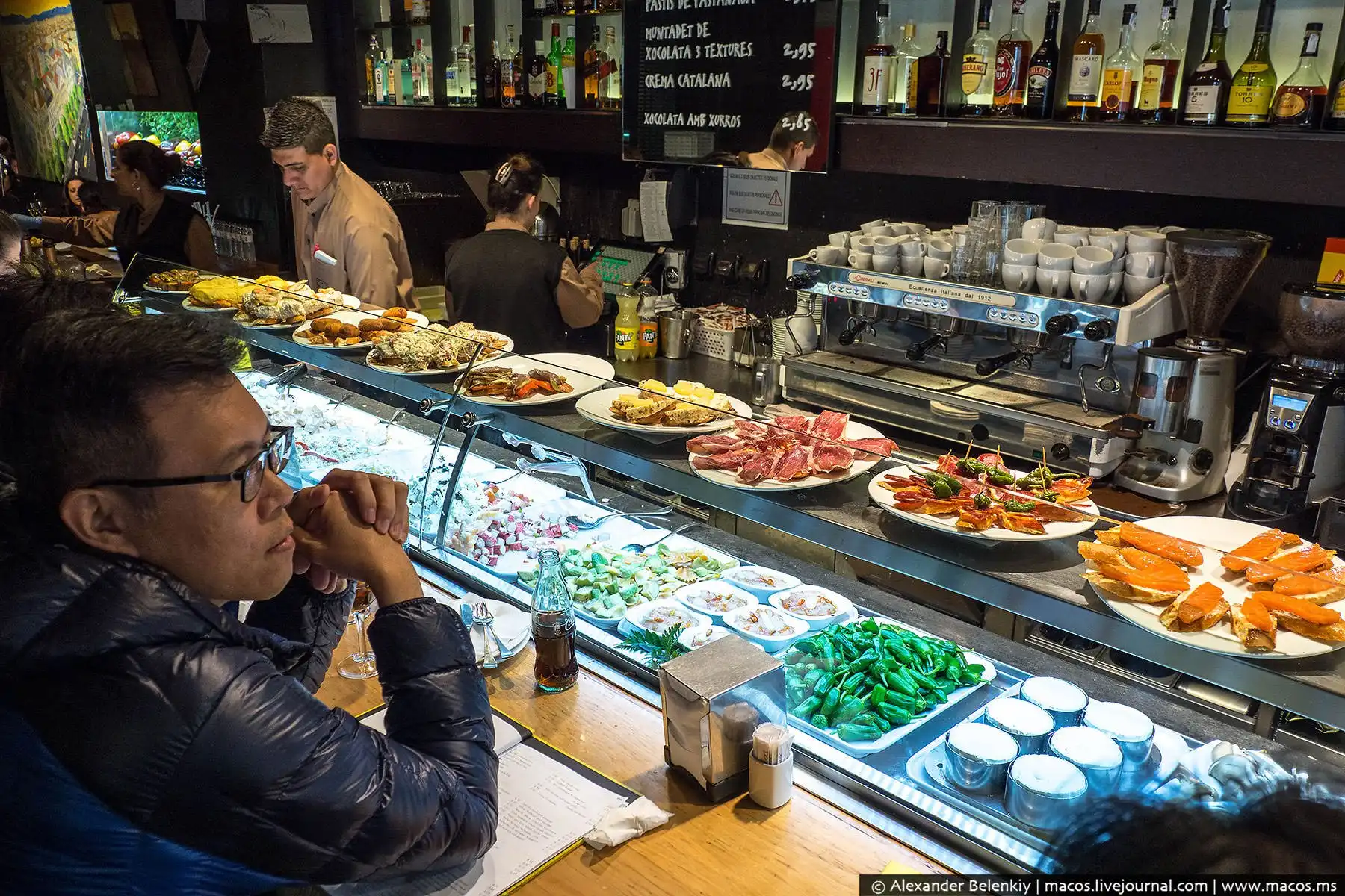 Барселонская сервесерия удивительным образом напомнила мне суши-бары в далёкой Японии: там это просто забегаловки для работяг, расположенные у станций метро: зашёл, присел за стойку (или даже привстал, как в советской чебуречной), ткнул пальцем в желаемую рыбину - через минуту получил парочку суши на "тарелке" из бамбукового листа. Вот и здесь так же.