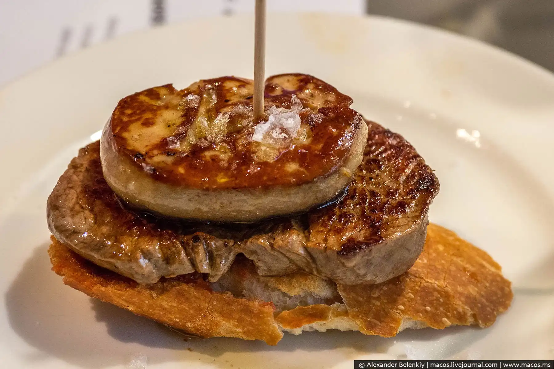 "Бутерброд" из стейка с фуа гра! Закуски, говорите? Даже стыдно показывать, ЧТО я этим закусывал - банальный Гиннесс! В Испании с пивом так же плохо, как хорошо с едой. Кстати, с ирландским пивом тоже есть нюансы, обязательно уточняйте, а лучше просите показать бутылку: "тот самый" это Guineess draught, увидите на бутылке надпись "original" - лучше сразу отказаться.