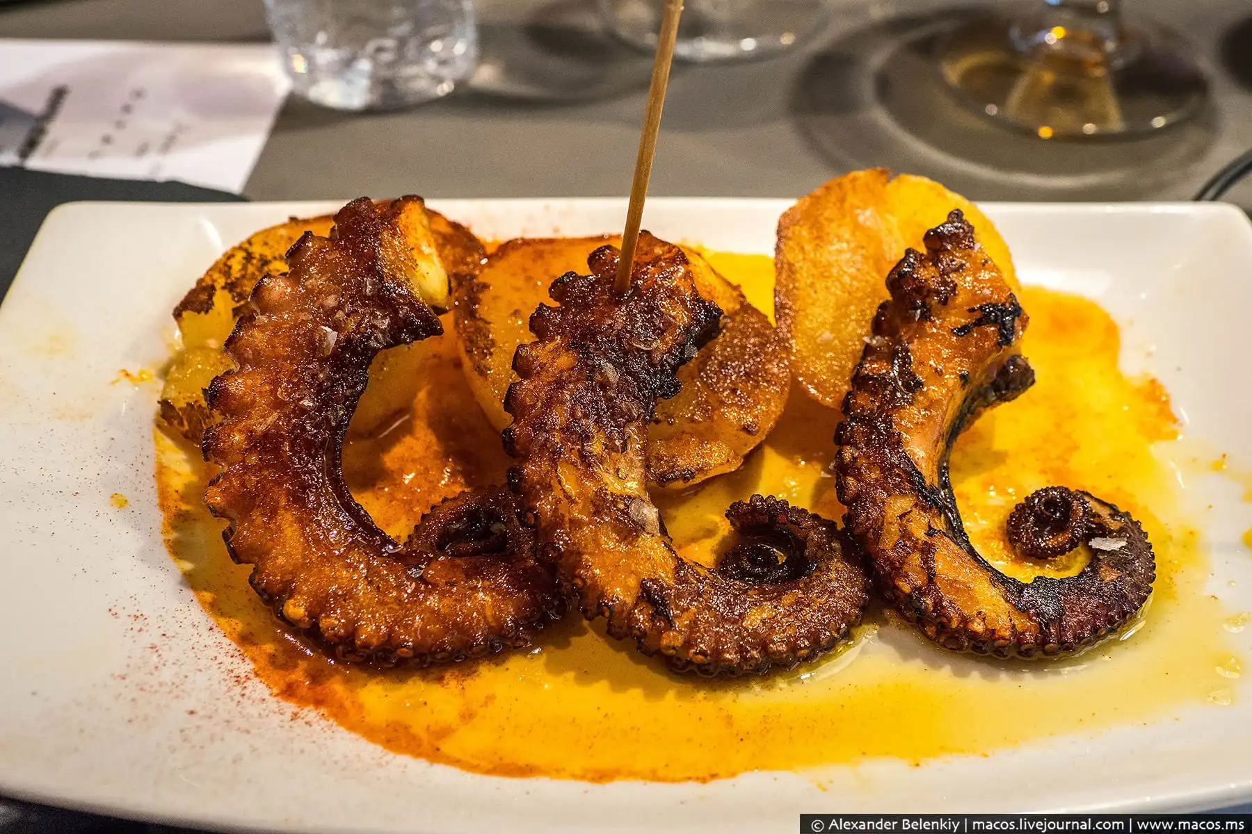 Каталонская классика - жареный на гриле осьминог на подушке из картошки. Объеденье! В порции три штуки, стоит 6,5 евро!