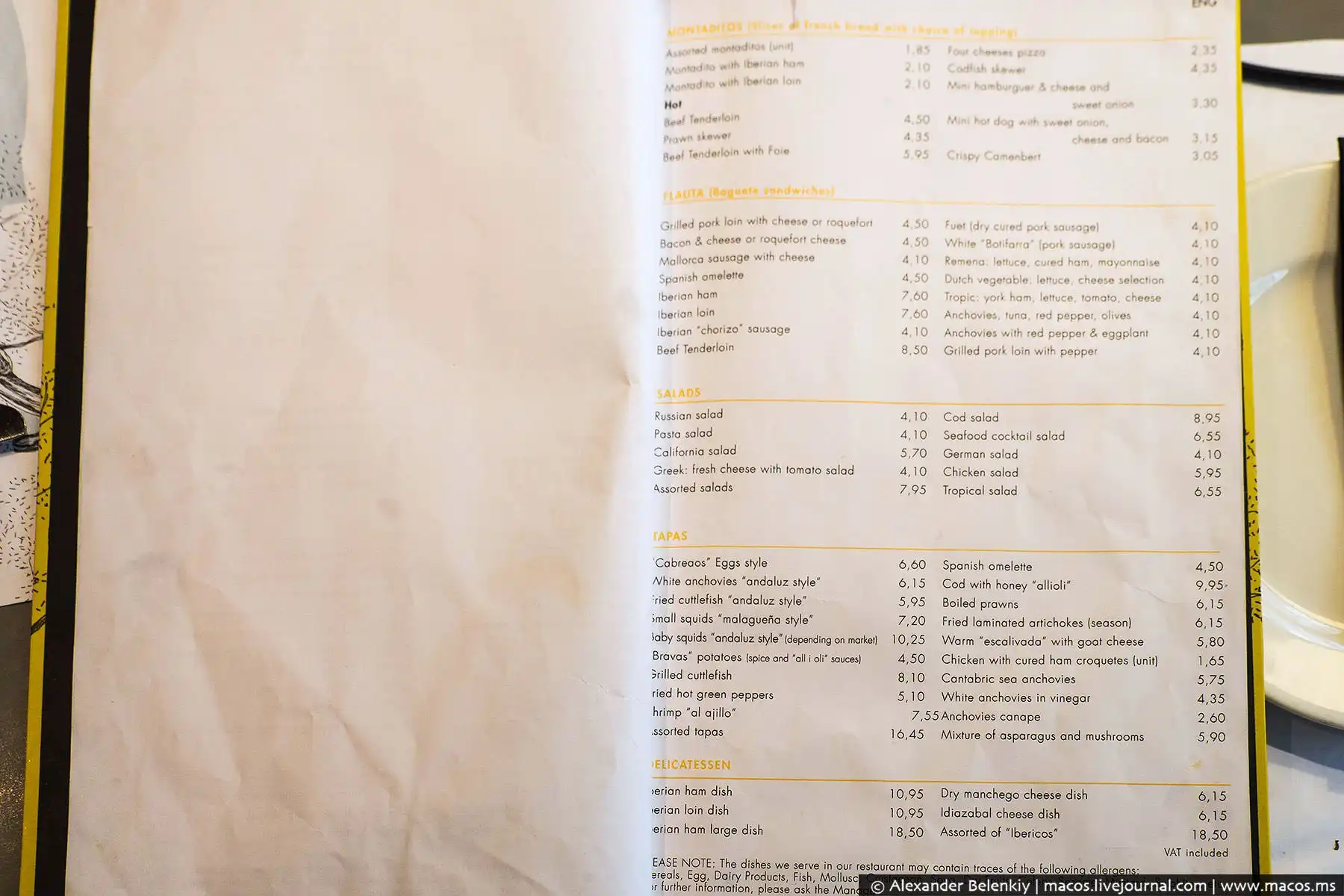 Можно делать заказ по меню. Как видите, здесь не только бутеры и тапасы, есть и салаты. Меню показываю для наглядности, зацените цены!