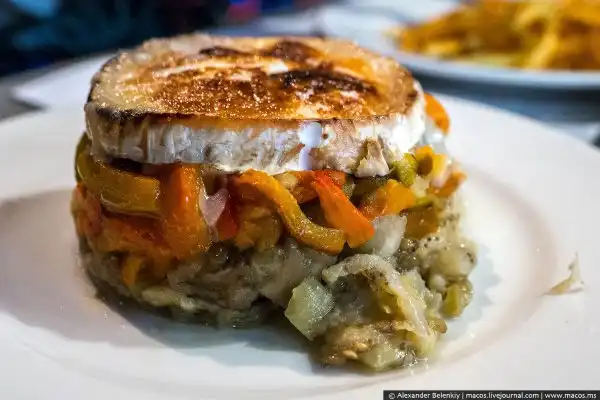 Рататуй из баклажанов под шляпкой из козьего сыра.