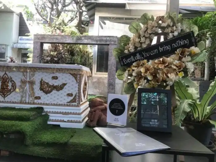 В Таиланде есть одно очень необычное тематическое кафе, цель которого - заставить людей ценить свою жизнь. Интерьер заведения оформлен в тематике смерти. Здесь преобладают черные тона, похоронные венки выступают в качестве декораций, блюда имеют названия "старение", "мучение", "болезнь", "смерть" и подаются в соответствующим виде. Чтобы получить скидку, можно даже лечь в гроб, который стоит здесь специально для этих целей. Как отмечает владелец заведения, его задача - помочь людям принять смертность, и вдохновить их наслаждаться каждым днем жизни, потому что они никогда не знают, когда все закончится.