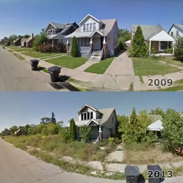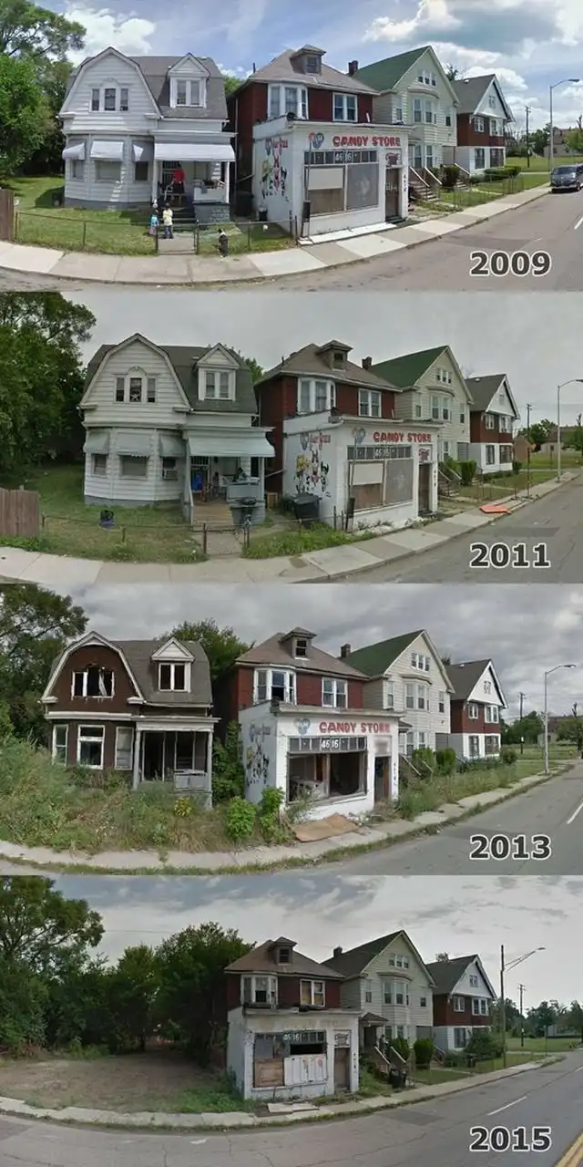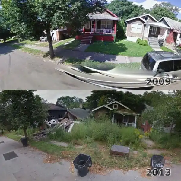 Очень показательные фотографии из пригорода Детройта, города, который мучительно умирает после расцвета. Город стремительно разросся во время военных заказов и бума производства автомобилей, но потому начал умирать еще в 1960, причем оттоку усугубил нефтяной кризис 1973 года. Двухмиллионник скатился до населения в 700 тысяч. В центре города заброшены целые районы, небоскрёбы стоят пустыми. А вот тут ну нас фотографии есть, которые показывают, как умирает пригород.
