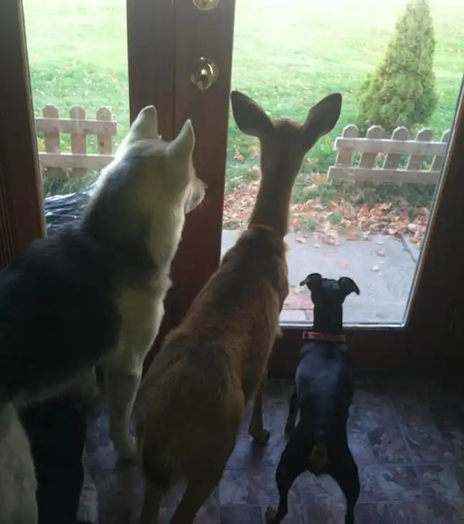 Когда-то этого олененка нашли у ног сбитой насмерть оленихи и забрали его в дом. Теперь он считает себя собакой