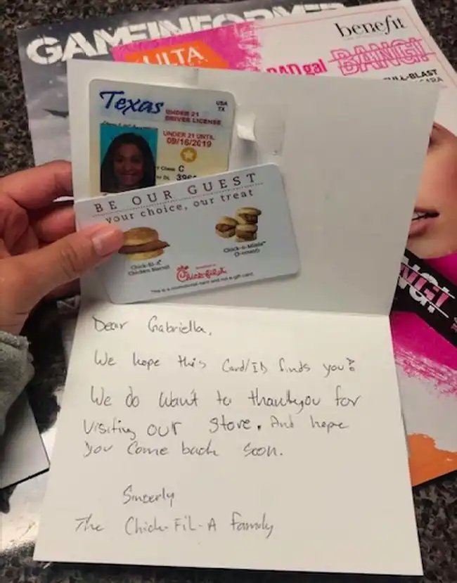 «Я потеряла свое водительское удостоверение и уже сделала новое, когда получила по почте письмо от сети бургерных с моими документами и подарочным сертификатом»